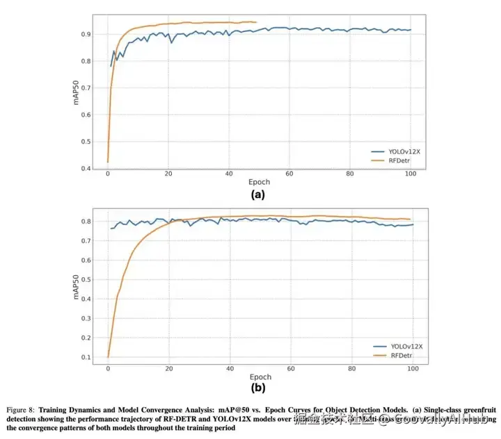 图8提供了RF-DETR和YOLOv12X模型的平均精度(mAP@50)与训练历元数的详细可视化对比,揭示了它们在训练阶段的学习效率和稳定性。图8a跟踪了单类青果检测的性能,其中基于transformer-based的目标检测模型 RF-DETR展示了令人印象深刻的早期收敛性,在 10 个epoch之前就达到了平稳状态。这种快速稳定的特性凸显了RF-DETR对复杂果园场景的快速适应能力,与YOLOv12X等基于CNN的传统模式相比,这是一项重大进步。