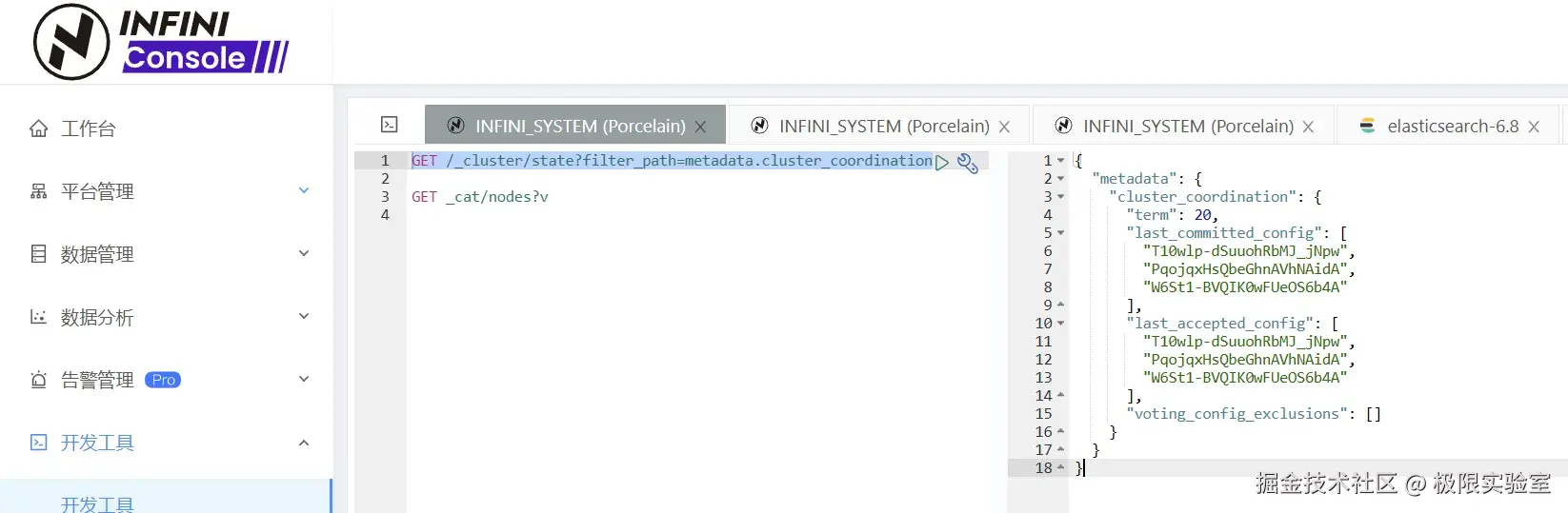 因为要保持投票集合为单数,Easysearch 的动态投票配置管理机制并没有把已经离线的 node-3 移出投票集合。