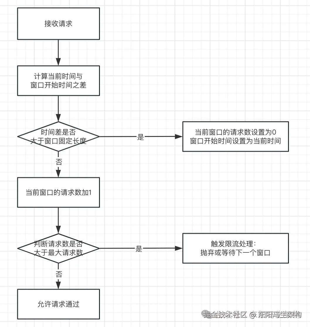 在一个固定长度的时间窗口内限制请求数量。每来一个请求,请求数加一,如果请求数超过最大限制,就拒绝该请求。