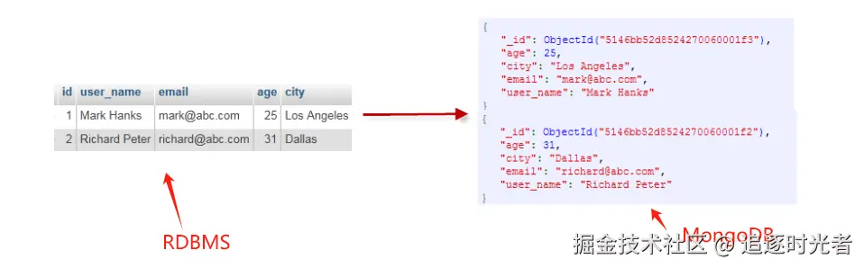 - MongoDB 的文档可以理解为关系型数据库(MySQL)的一行记录。