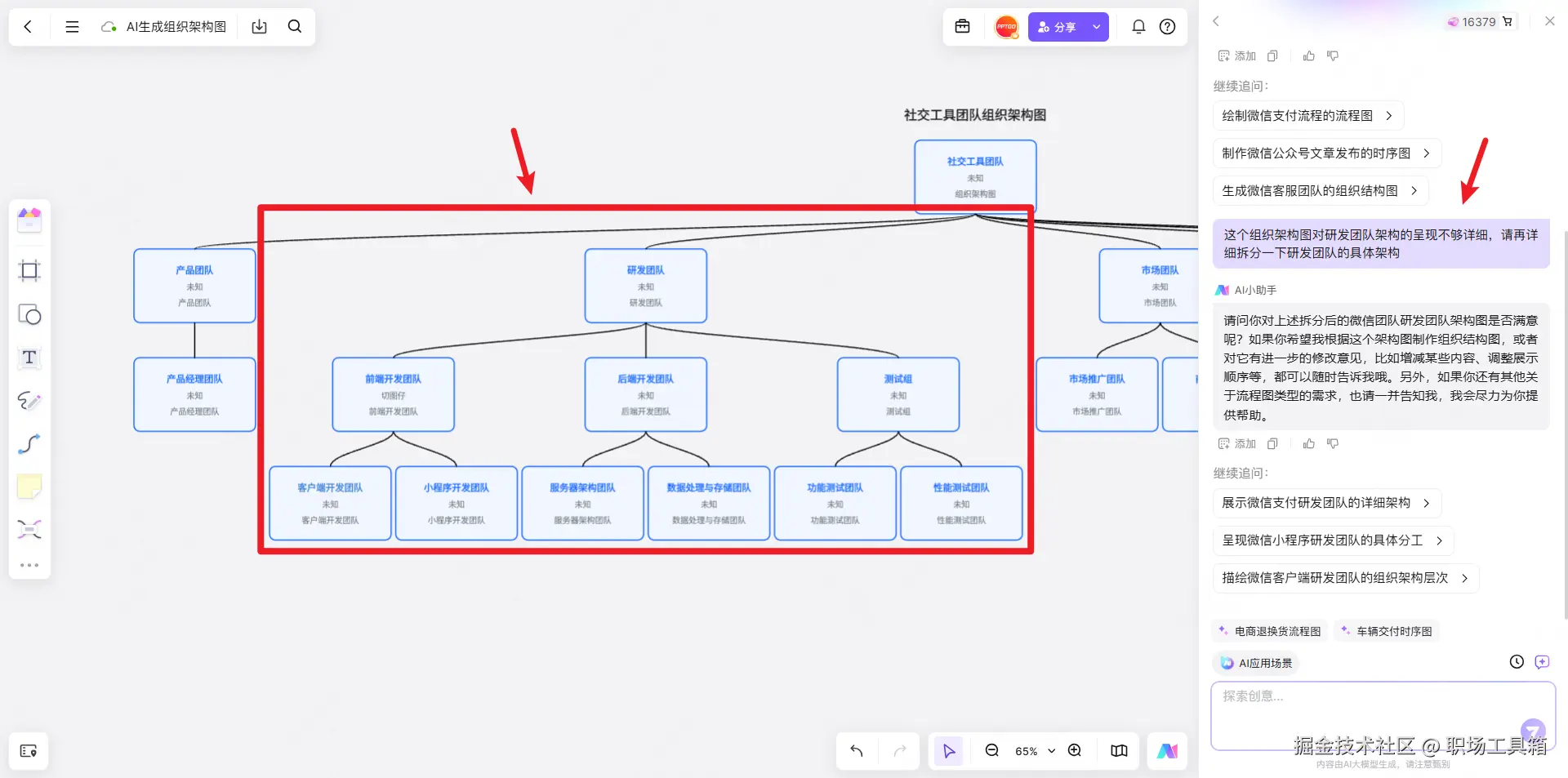 boardmix AI支持继续追问和多轮对话能力,如果对AI生成的第一版组织架构图不满意,可以在输入框中向boardmix AI提出自己的需求,譬如“组织架构图对某个部门的呈现不够详细,请再详细拆分一下该部门的具体架构”,让boardmix AI进一步细化组织架构图的内容,如下图所示。