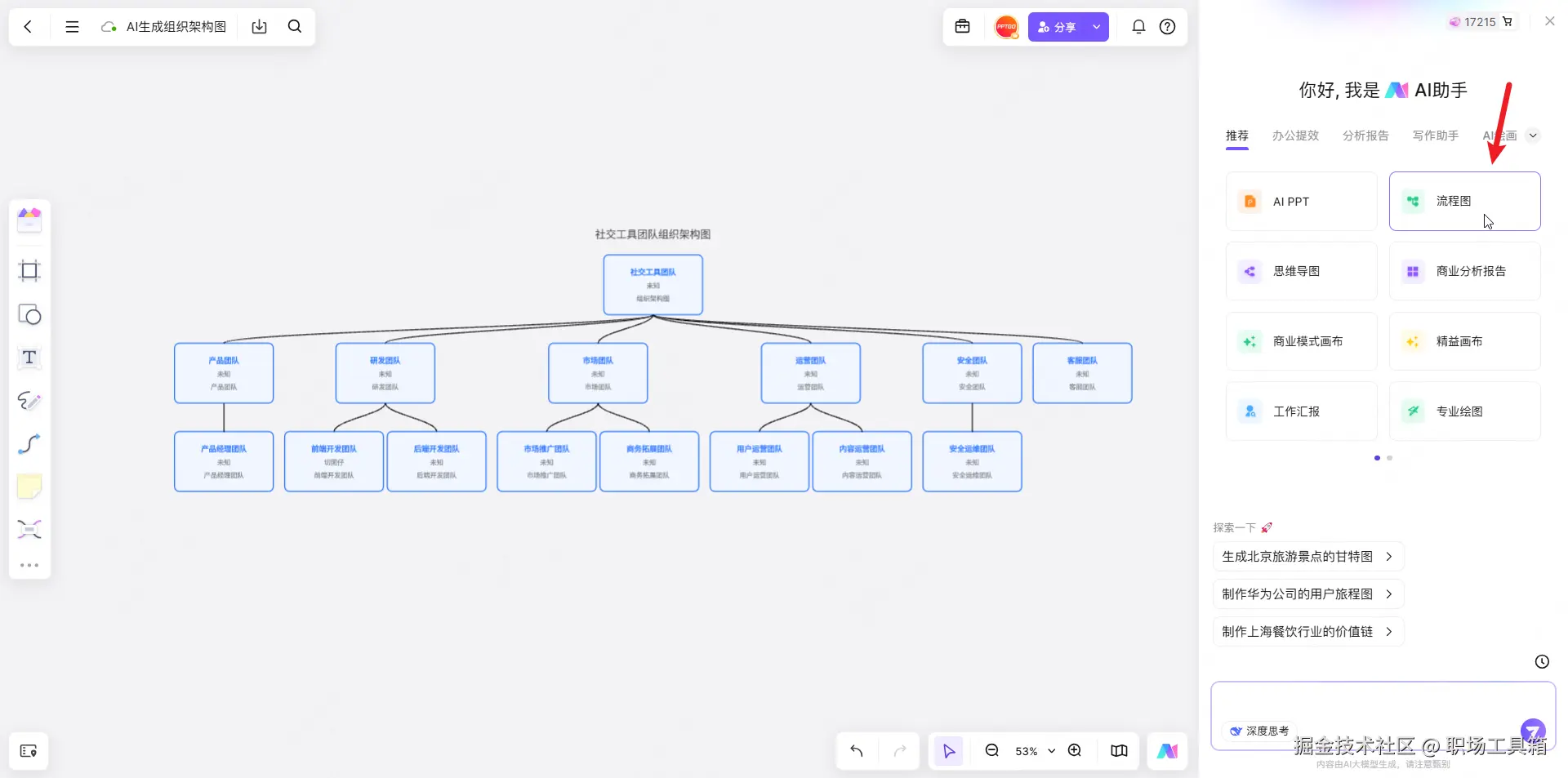 以往组织架构图的制作,有赖于制作者手动绘制,从零开始依次添加部门和下属的成员,整个制作过程耗时长,一丁点改动可能就要推倒重来。身处AI工具不断涌现的当下,我们可以基于AI工具(如boardmix)一键自动生成各类可视化图形或图表,包括组织架构图、流程图、思维导图、商业画布、路线图等,对比传统制作方式简直是降维打击,且支持继续追问和多轮对话,反复调整直至得到满意的组织架构图,办公效率原地拉满!
