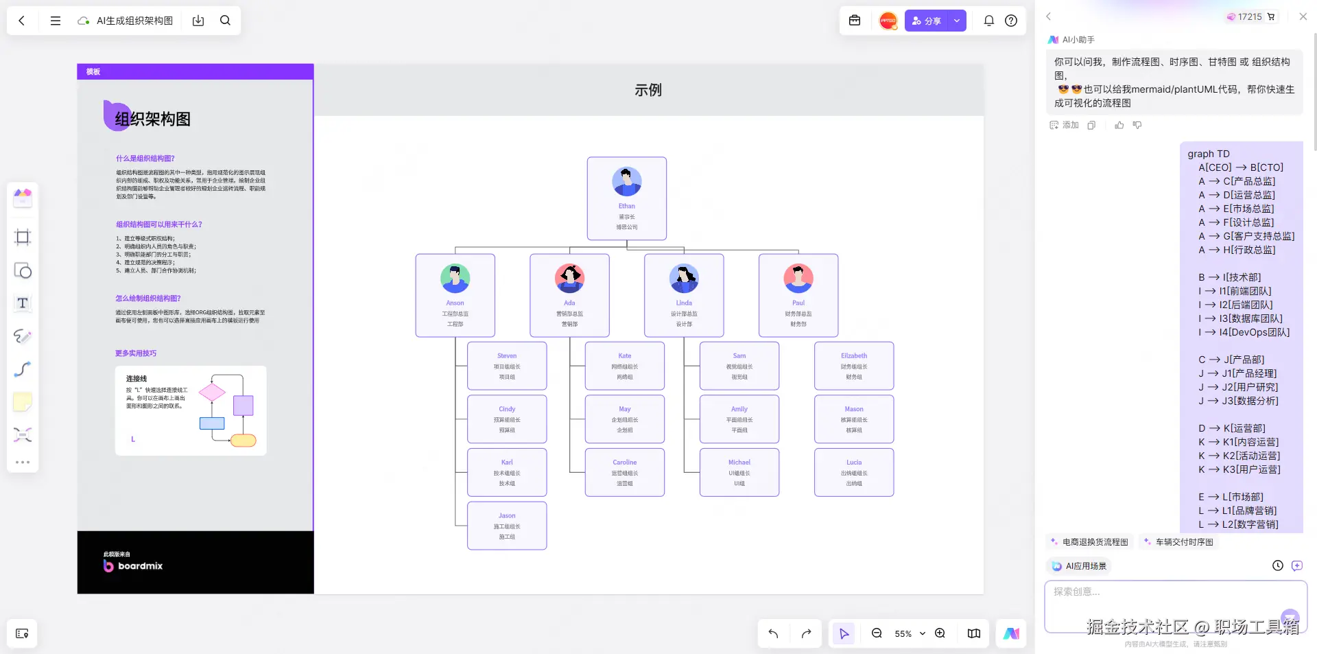 纵观市面上现有的AI工具,有多种基于AI自动生成组织架构图的方式,譬如AI先生成Mermaid格式的代码,再渲染得到组织架构图,或是直接返回视觉化的组织架构图,实际使用推荐优先使用后者,这种方式的代表工具有boardmix AI、Whimsical等。