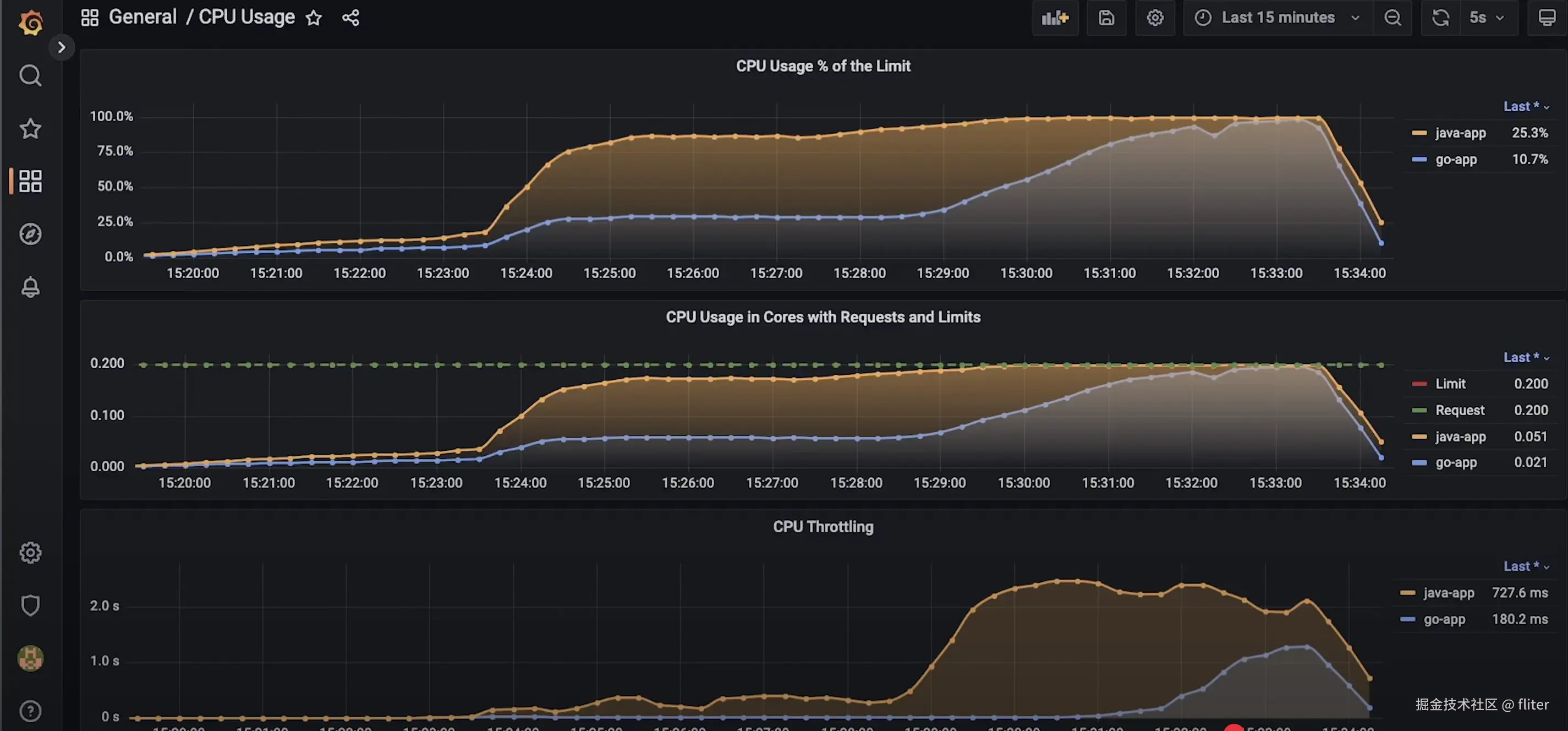在这个包含详细 CPU 使用率的仪表板中,您可以看到 Java 进程受到了相当严重的节流(throttled)。