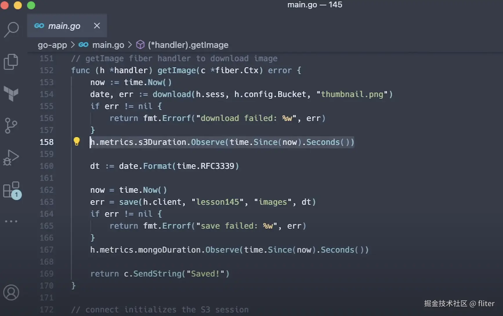对于第二个测试,在 Go 语言中,我们有一个 getImage Fiber 处理器(Handler),它使用 download 函数从 S3 存储桶拉取 S3 图片,并使用 save 函数将最后修改日期插入到 MongoDB。为了共享 S3 客户端和 MongoDB 连接池,我们创建了一个自定义的处理器,并添加了 session 和 client 属性。然后,在初始化处理器时,我们调用辅助方法来建立与 S3 和 MongoDB 的连接。您不必共享 S3 客户端,但每次访问 S3 时,它都会重新进行身份验证,这也会消耗时间。