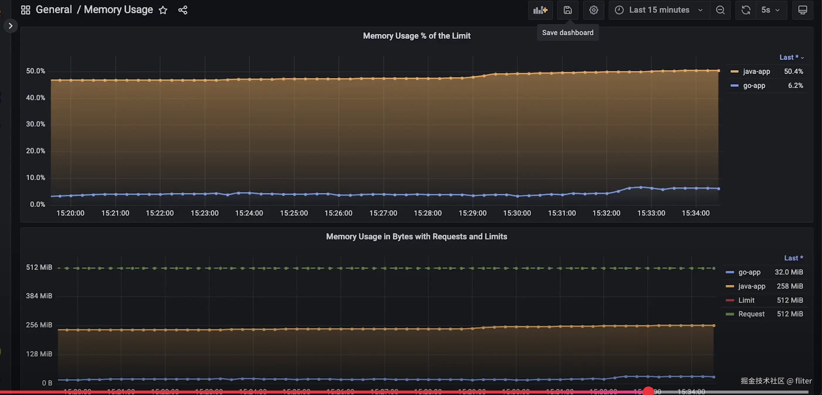 为了收集基本的容器指标,例如 CPU 使用率,我们将部署 cAdvisor 作为一个守护进程集(DaemonSet)。您可以监控 CPU 使用率,既可以看作是分配给容器限制的百分比,也可以是实际使用的 CPU 核心数,并将请求(requests)和限制(limits)以线的形式绘制出来。在 Kubernetes 中,由于使用了 cgroups,测量 CPU 节流(throttling)至关重要,因为它会极大地影响应用程序的性能。