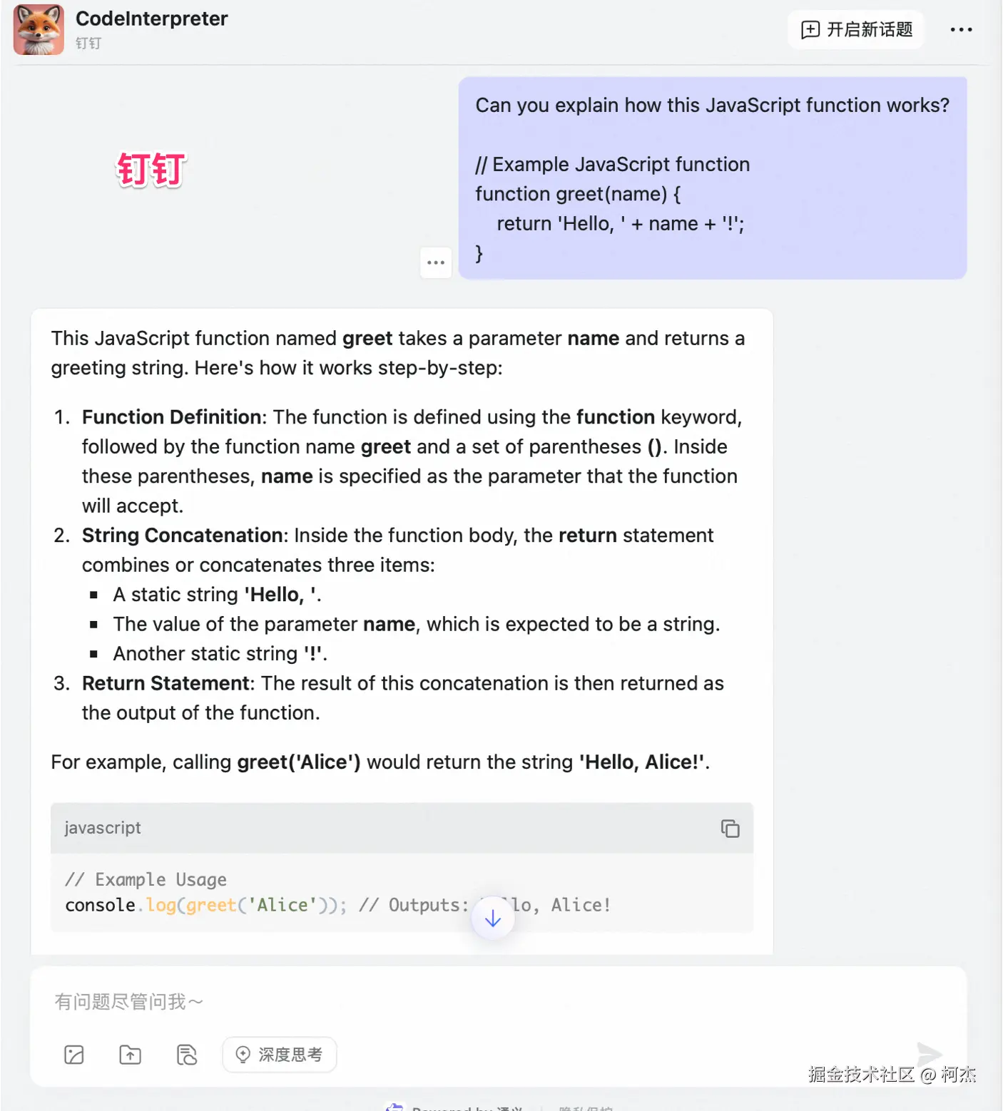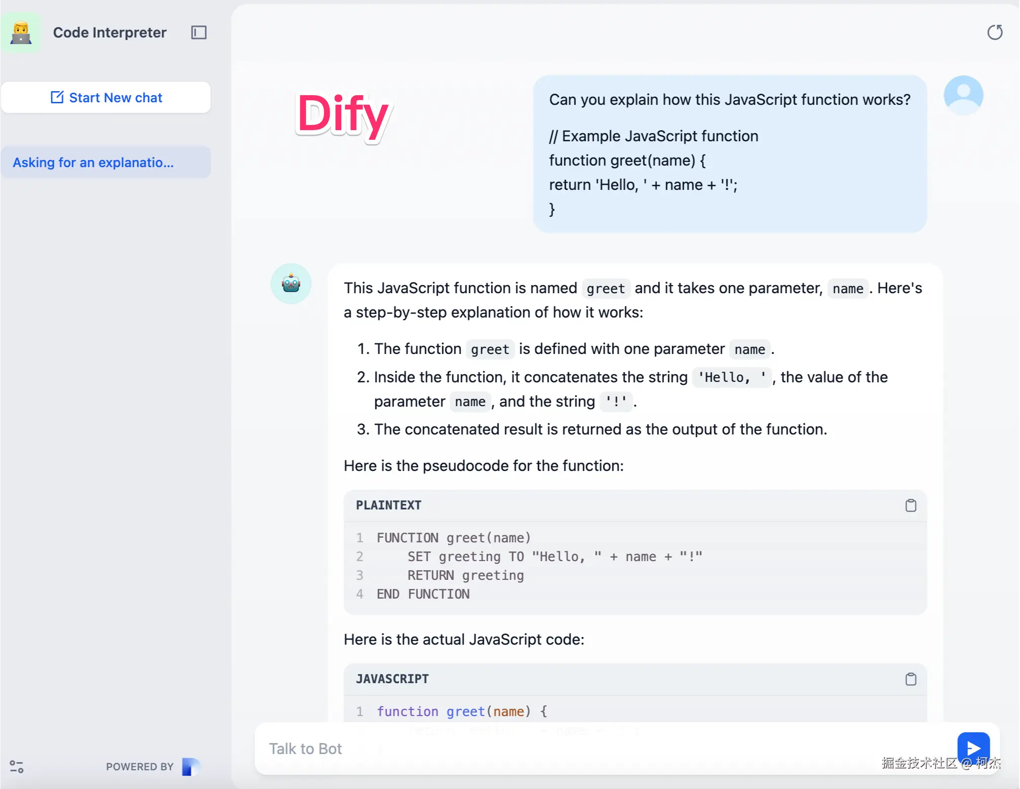 以 Dify 官方推荐的「Code Interpreter」应用为例,在 Dify 中效果如下:
