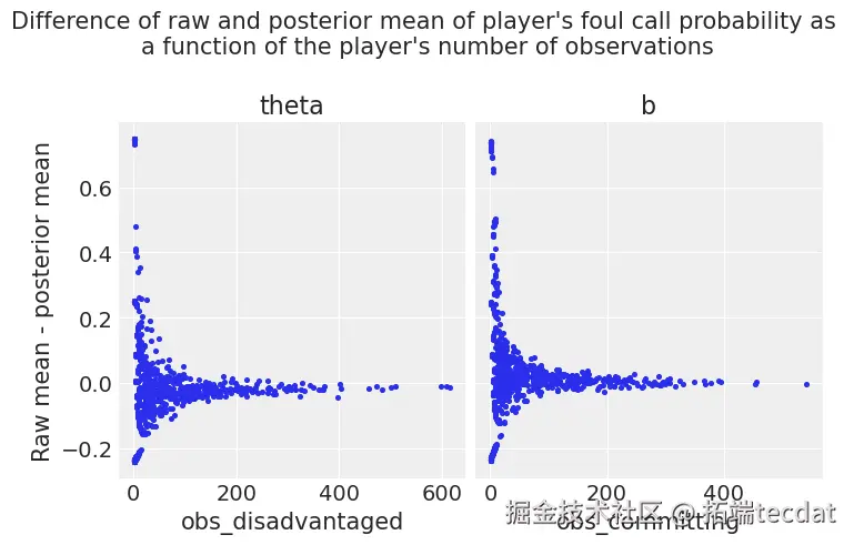 我们首先绘制每个被侵犯和犯规球员的原始平均概率(来自数据)与后验平均概率之间的差异((y)轴),以及每个被侵犯和犯规球员的观察数量((x)轴)。这些图表明,正如预期的那样,我们模型的层级结构倾向于将观察数量较少的球员的后验估计值拉向全局平均值。