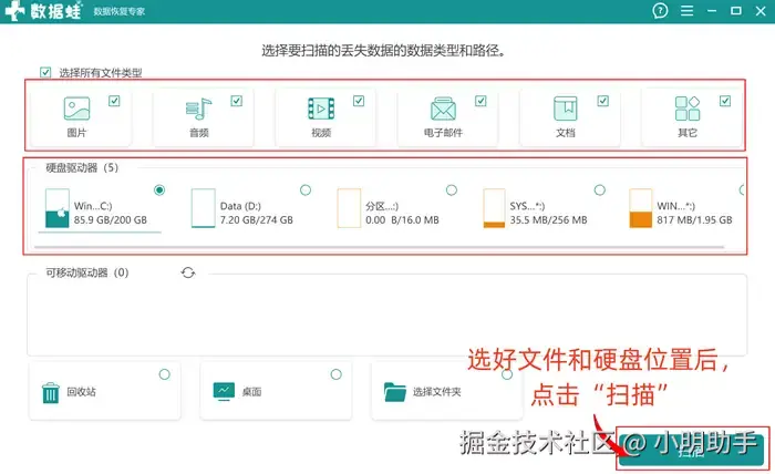步骤1: 软件的首页上选择自己需要恢复的文件类型和需要电脑扫描的硬盘,点击“扫描”;