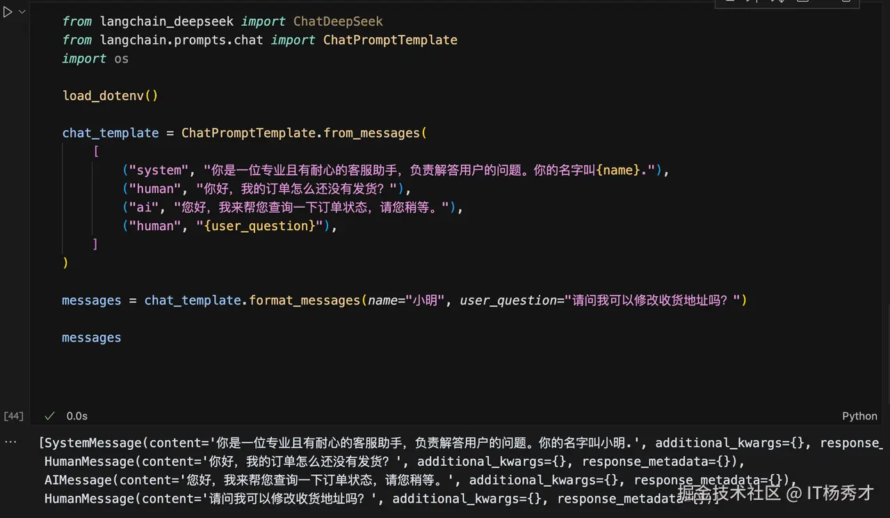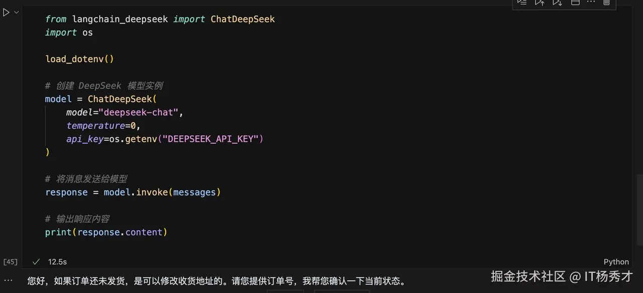 可以看到经过format_messages函数格式化处理后,最终的提示词messages中这组对话已经将我们的最终要传入的变量"小明"替换到原来的"name"参数处,将原来模板中的user_question替换为"请问我可以修改收货地址吗?"这个字符串。接下来再下一个cell中调用DeepDeek大模型接口,把这个messages传给DeepDeek,然后看下DeepDeek给我们返回什么?
