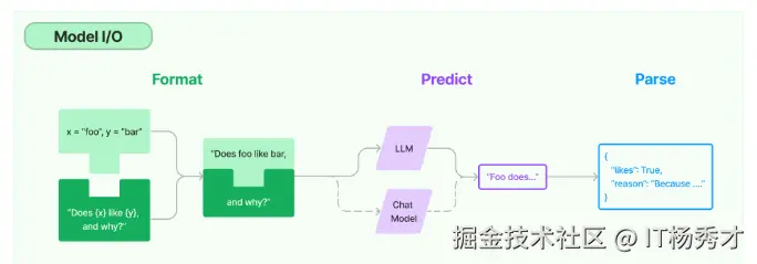 在 LangChain 的 Model I/O 模块设计中,主要由三个关键组件构成:Prompt Template(对应图中的 Format)、Language Models(对应 Predict)、以及 Output Parser(对应 Parse)。