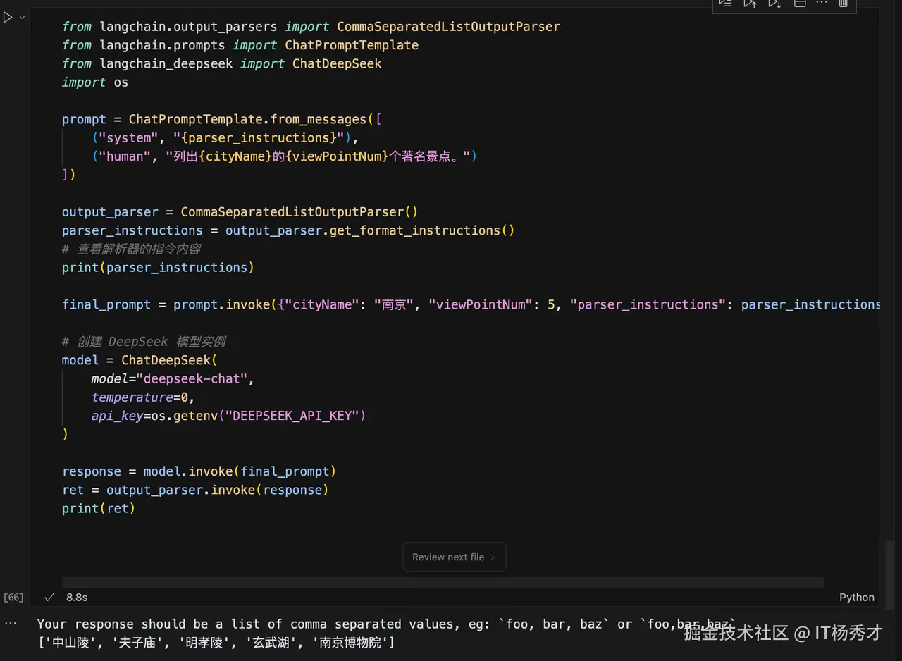 这里以CommaSeparatedListOutputParser为代码示例看一下Output Parsers的具体用法 :