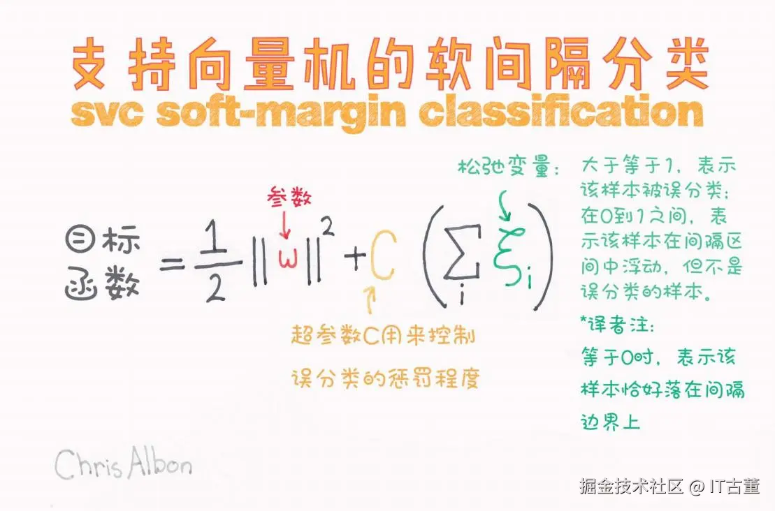本文结合一幅手绘图,深入解释了支持向量机的软间隔分类方法的目标函数、变量含义以及参数调控逻辑。图示和公式相结合,可以帮助我们更直观地理解支持向量机的核心思想: