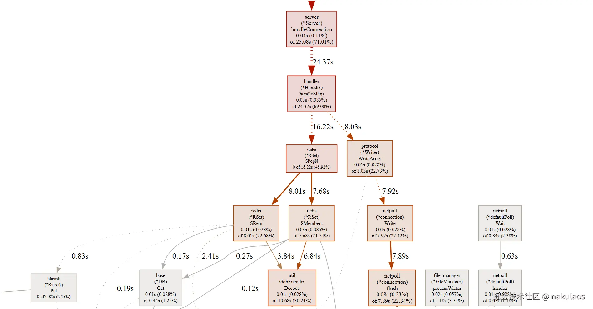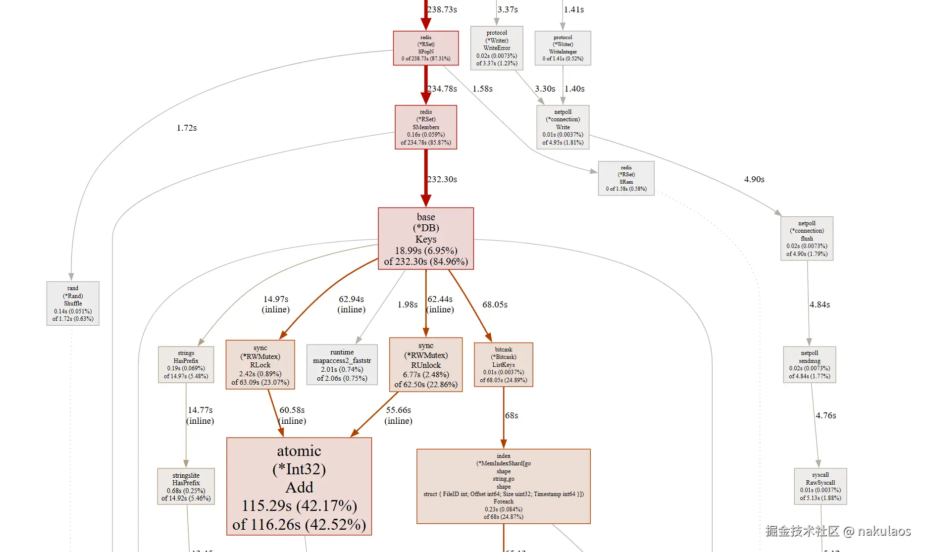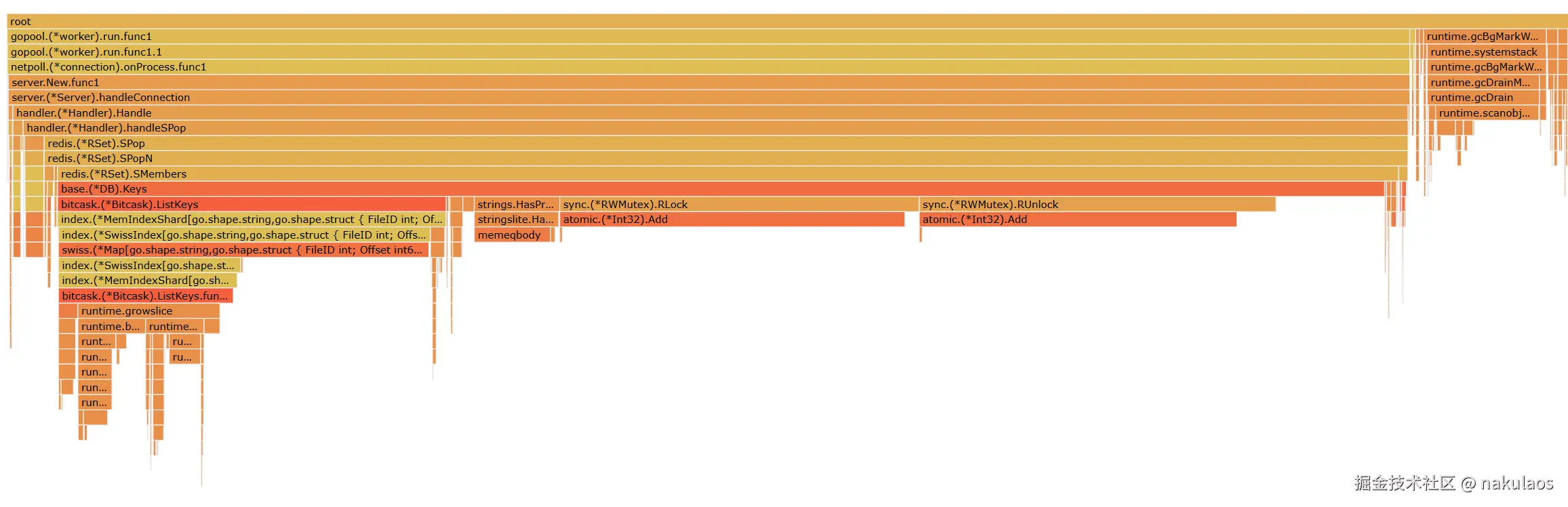 从图中可以看到SPopN中,获取对应key的成员函数(SMember)占了85%的时间,这个就是整个性能瓶颈所在的地方。