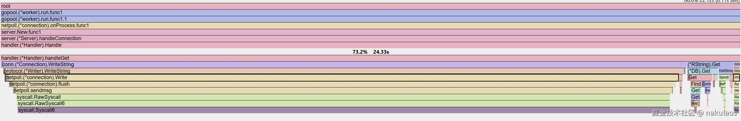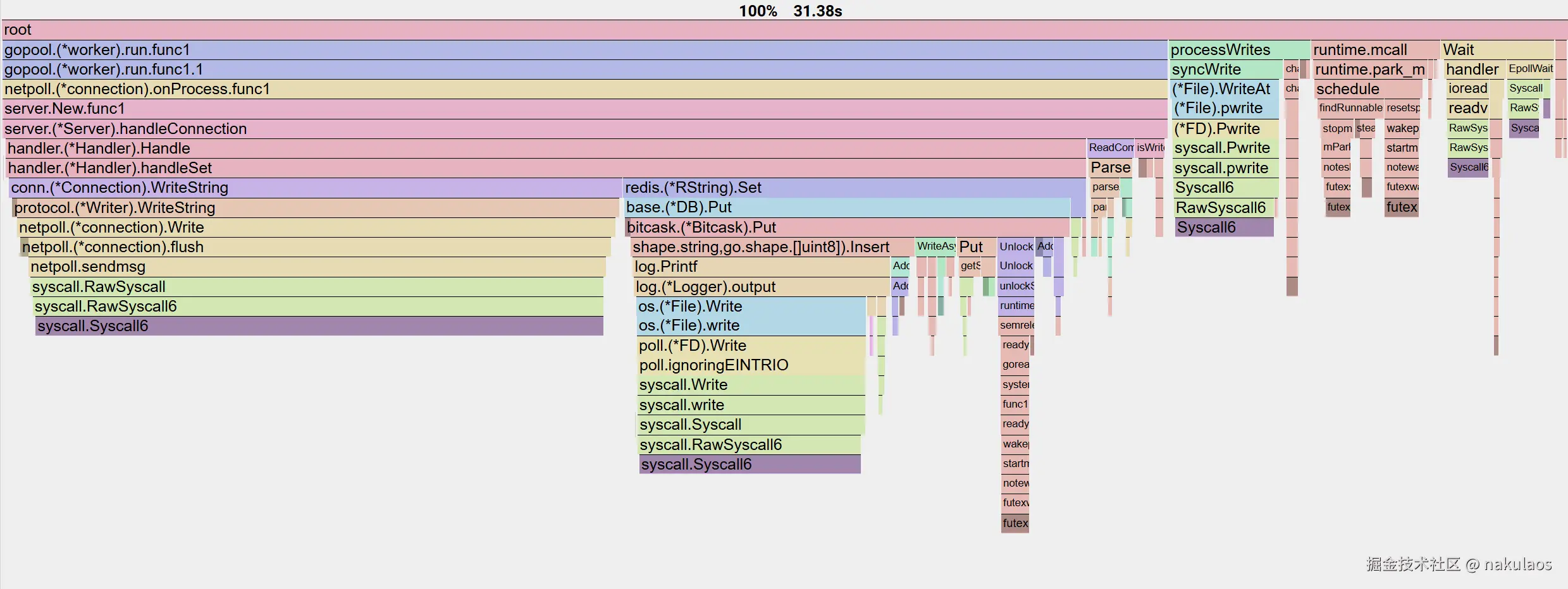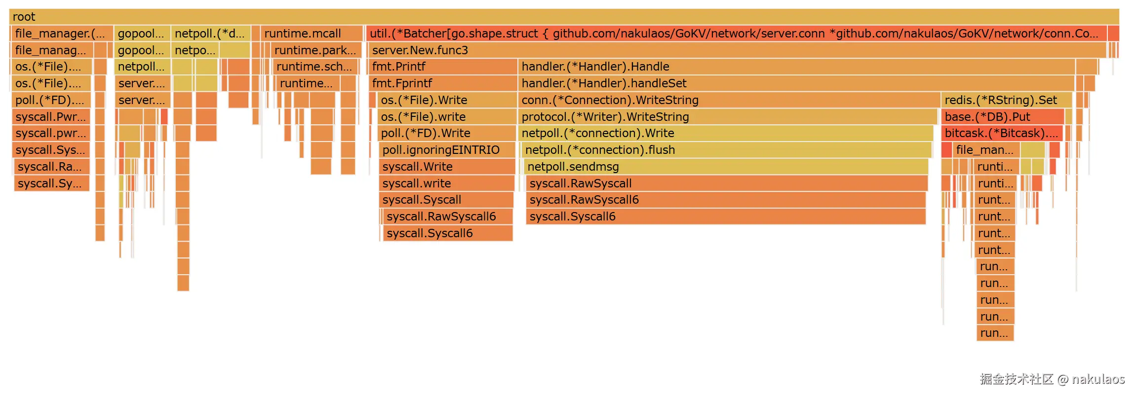 从火焰图可以看出,大部分时间,都在执行对应的系统调用,且主要集中在文件写入和网络传输