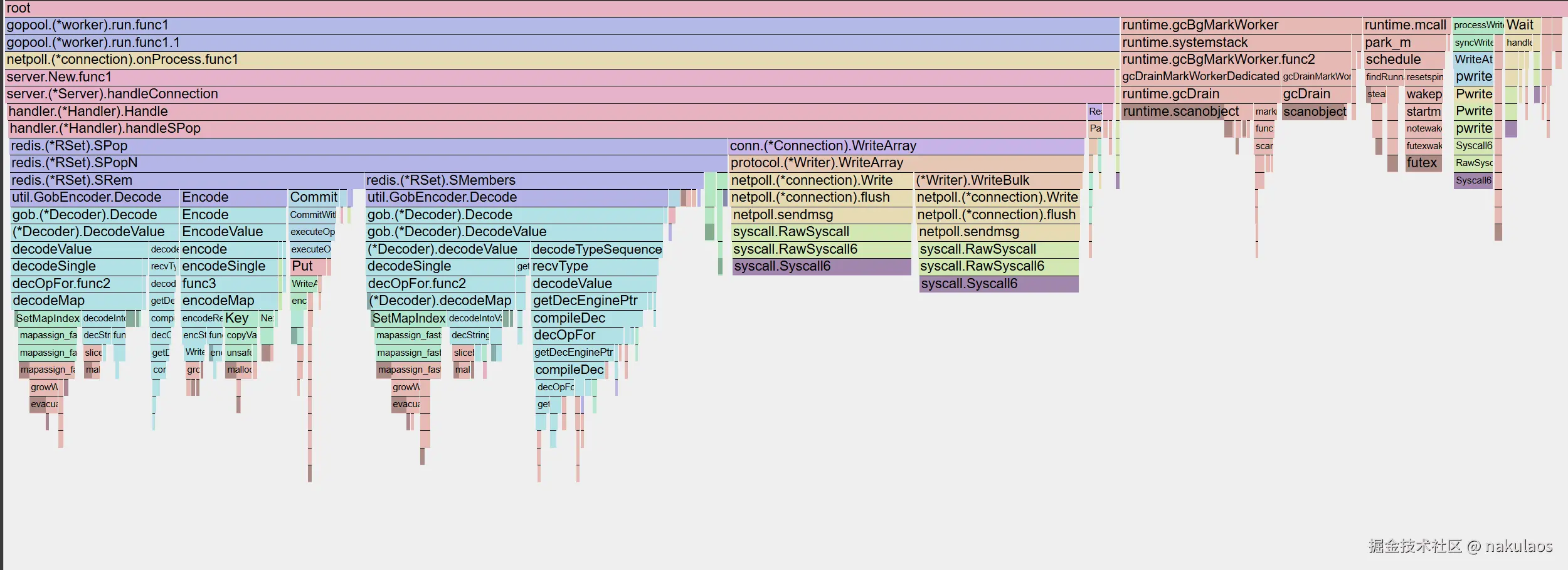 通过上述手段的优化,qps 大幅提升,6k-1w5波动。获取对应key的成员函数(SMember)从85%降到21%,此时序列化和反序列化占据大部分时间。