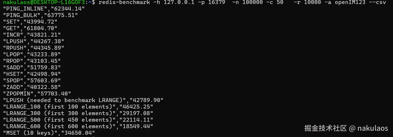 redis-benchmark -h 127.0.0.1 -p 16379 -n 100000 -c 50 -r 10000 --csv