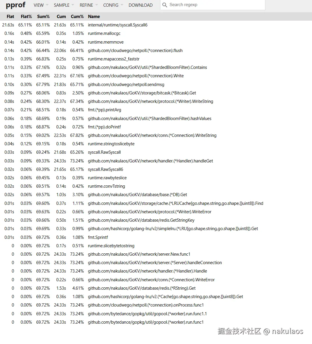 从压测结果,GoKV的Get,Set的压测结果大概能达到redis的一半左右,List的增加删除能达到redis的1/4左右,其他就相差的挺远的