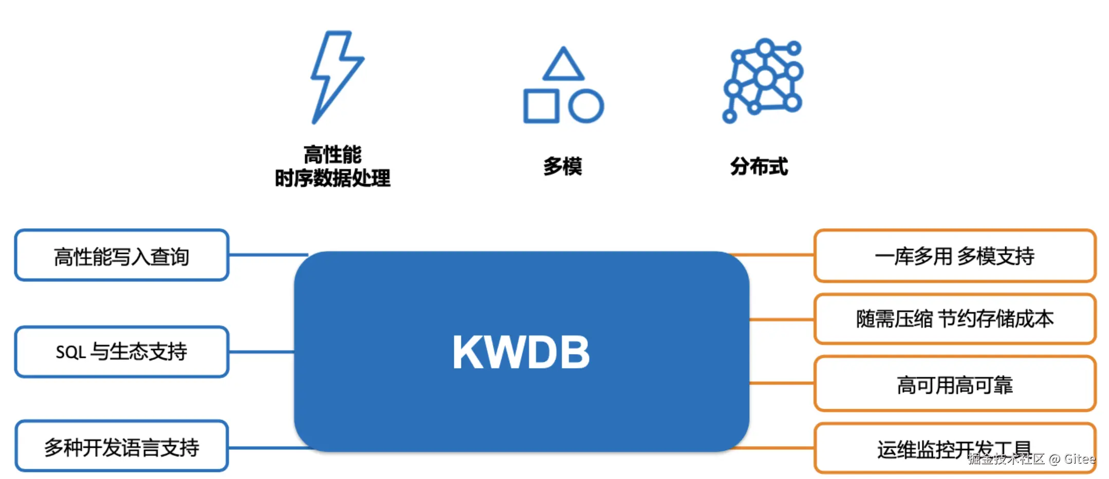 KWDB 源自浪潮 KaiwuDB,在开放性、可扩展性、性能和易用性方面具备显著优势。KWDB 在同一数据库实例内支持同时构建关系型与时序型数据库,实现统一接入、融合存储与分析处理,可高效应对多模态数据融合处理挑战。