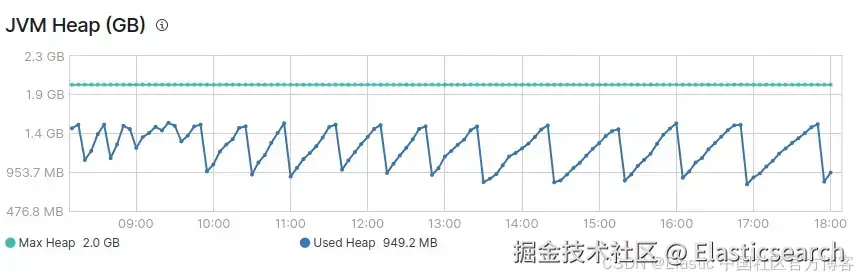 在上面的图像中,你可以看到 JVM 堆的正常锯齿状变化。