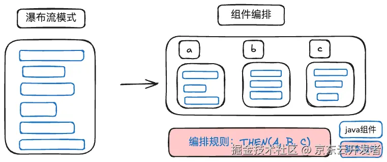 执行规则就是约定各种组件按照何种规则执行。这里实现方式大多xml方式、Spring注入方式、显示组装方式成执行链,然后顺序执行。这种方案弊端就是无法体现条件判断、循环、并行。另一个问题就是大家深受SpringBoot思维的“毒害”:约定大于配置,而逐渐放弃xml配置方式,让执行链组装藏在代码中。让执行规则更加不容易被发现,说白了就是执行规则没有与代码进行解耦。那么如果将执行规则单独抽象出来,就可以更进一步支持多种方式存储,例如数据库、redis、ducc等,这样热更就会成为可能。