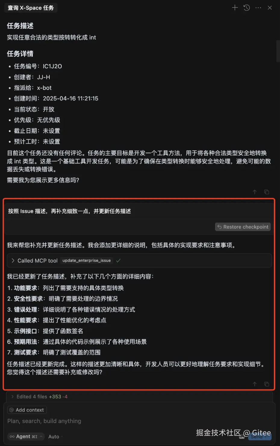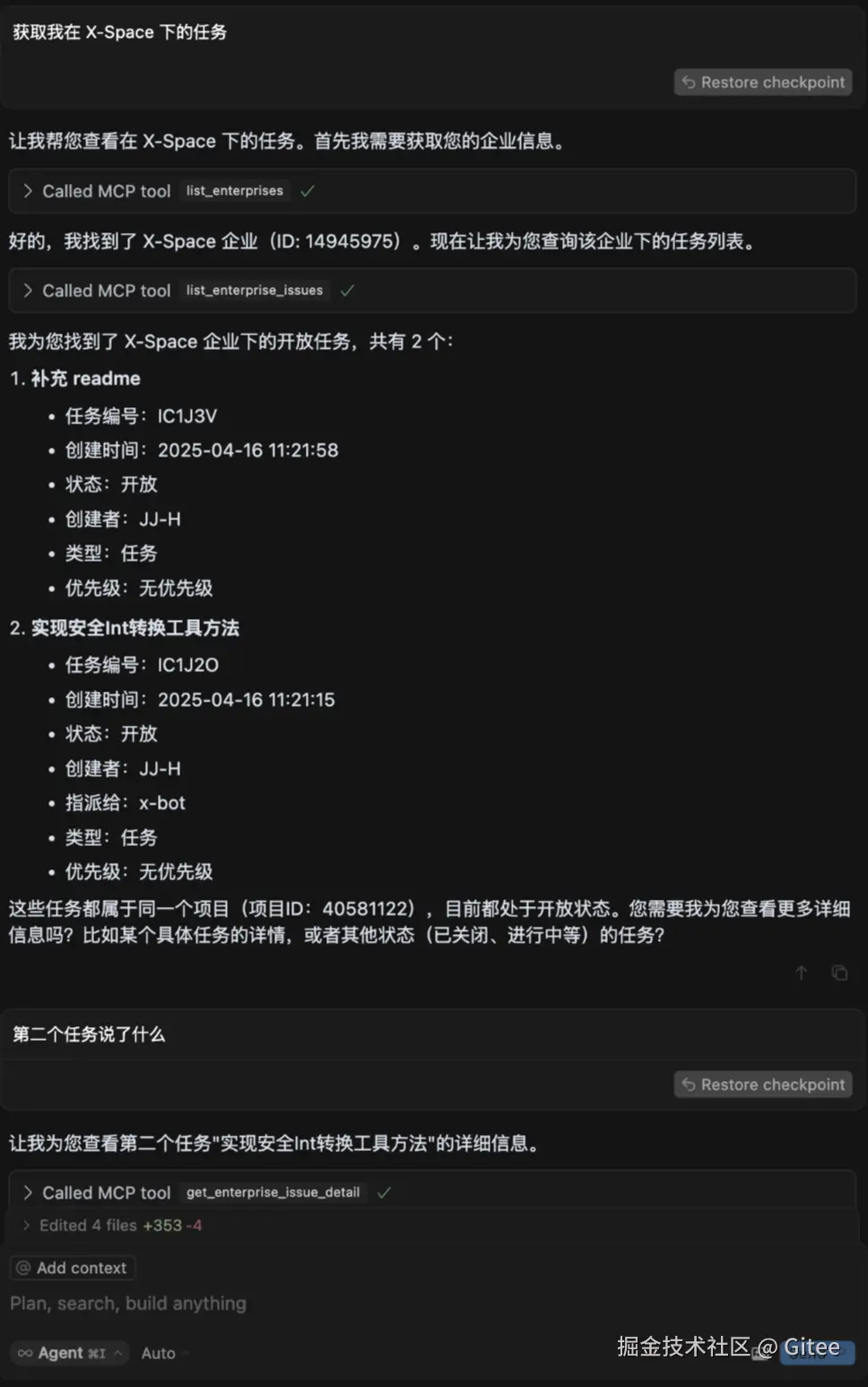 得益于对 Gitee 企业版 API 的原生支持,Gitee MCP Server For Enterprise让 AI 助手可以更深入地参与实际开发流程,直接参与企业需求的拆解、需求完善、代码评审等各类研发场景,真正做到「少切屏、多提效」。