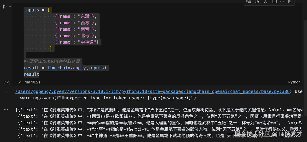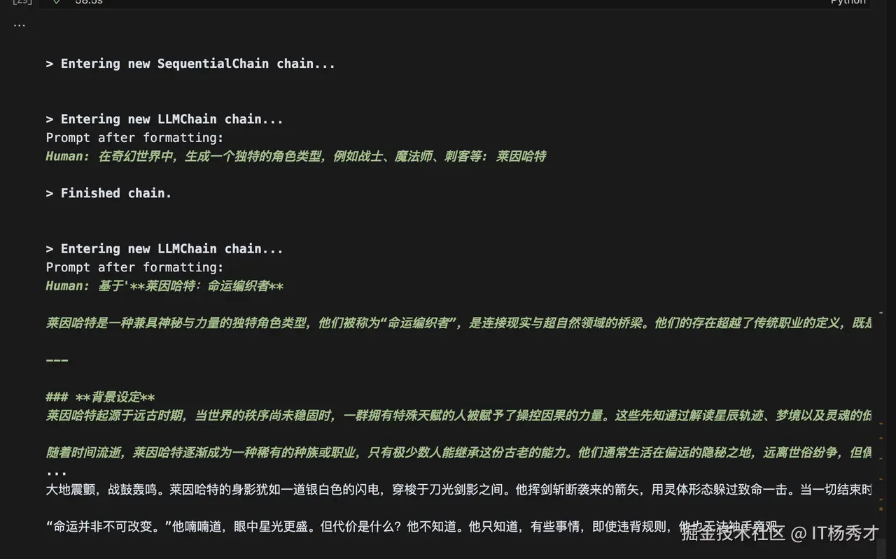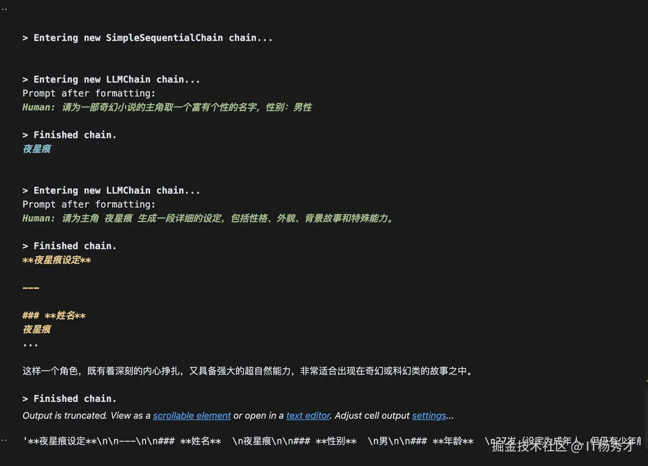 可以看到大模型返回了我们想要的结果,首先根据我们的输入"男性"生成了一个主角名:夜星痕,然后紧接着给出了夜星痕的任务设定。不难发现,我们在使用这个SimpleSequentialChain的守候,里面其实是串了两个基础链LLMChain,chain_one和chain_two,其中前一个链chain_one的输出作为后一个链chain_two的输入
