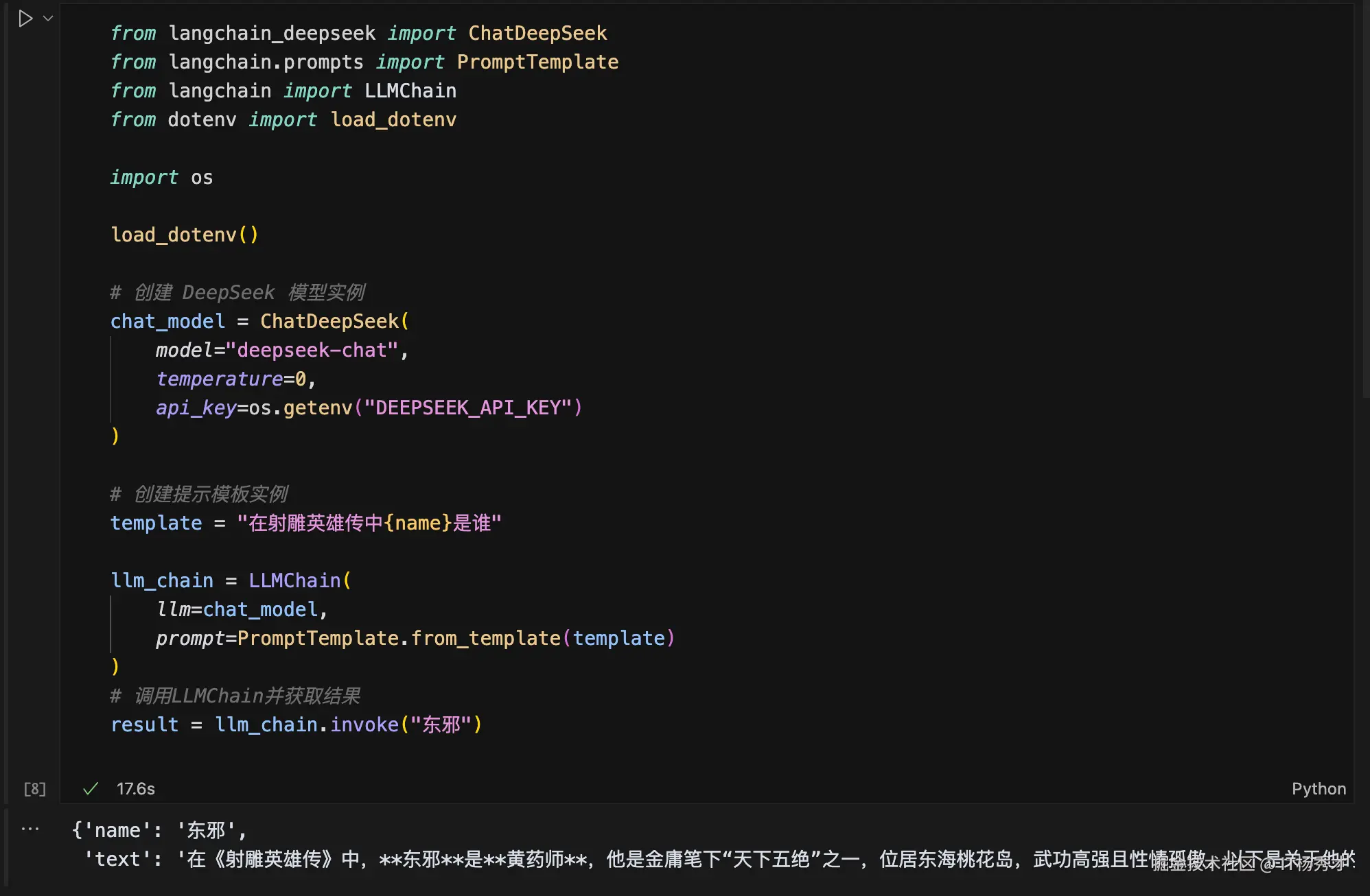 可以看到,在使用LLMChain的时候,跟我们前面的使用方式非常像,也是需要先定义好模型,提示词,然后调用大模型,获取输出,只不过使用LLMChain的时候不是直接由大模型实例去调用,而是由LLMChain去调用invoke方法