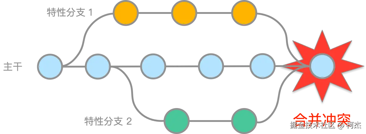 如果在某个项目开发中,分支多、参与人员多的“两多”问题无法避免的话,可以通过减少分支数量、减少分支存活时长、减少分支内代码行数的方式来降低代码冲突带来的影响。