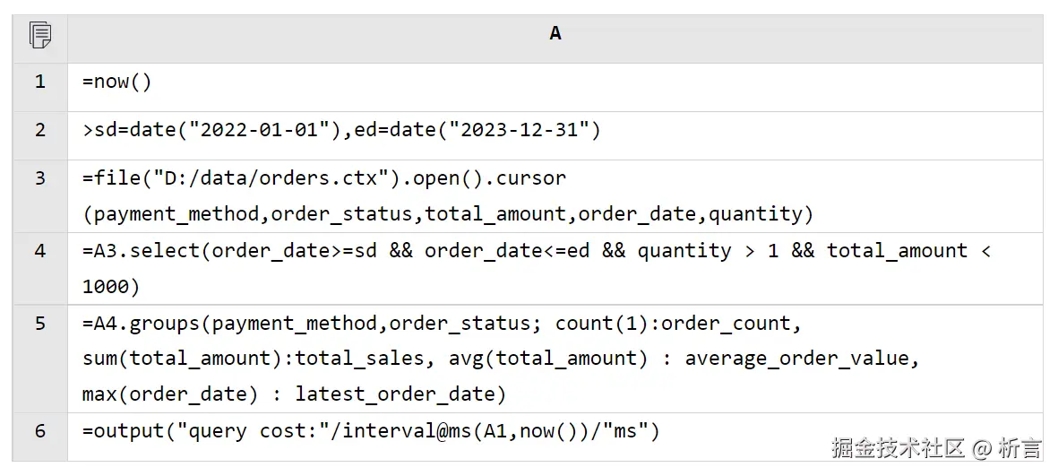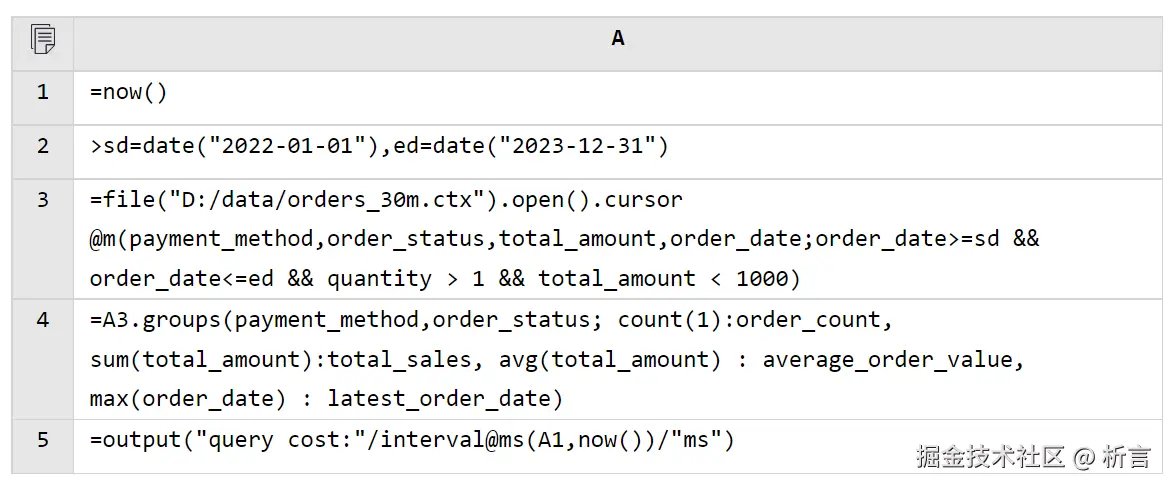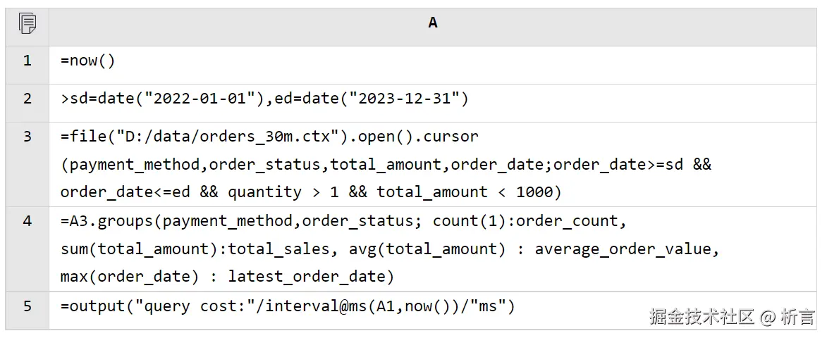 A3 创建文件游标,只读取用到的列,A4 用 select 进行条件过滤,A5 进行分组汇总,代码很简单不过多解释。