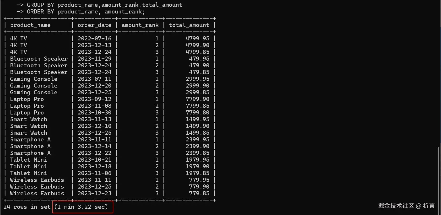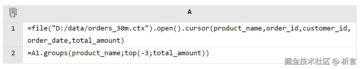 前面还有一个计算组内 TopN 的用例,这里就不给出详细测试结果了,文件仍会快很多(单线程 63.22/2.075=30.5 倍)。这里仅给出 esProc 的代码实现,来感受其语法的简洁和完善性。