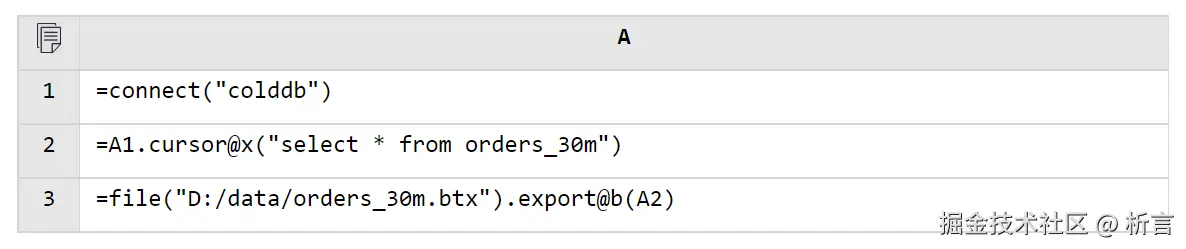 接下来将 orders 表导出转存成二进制行存文件 btx。