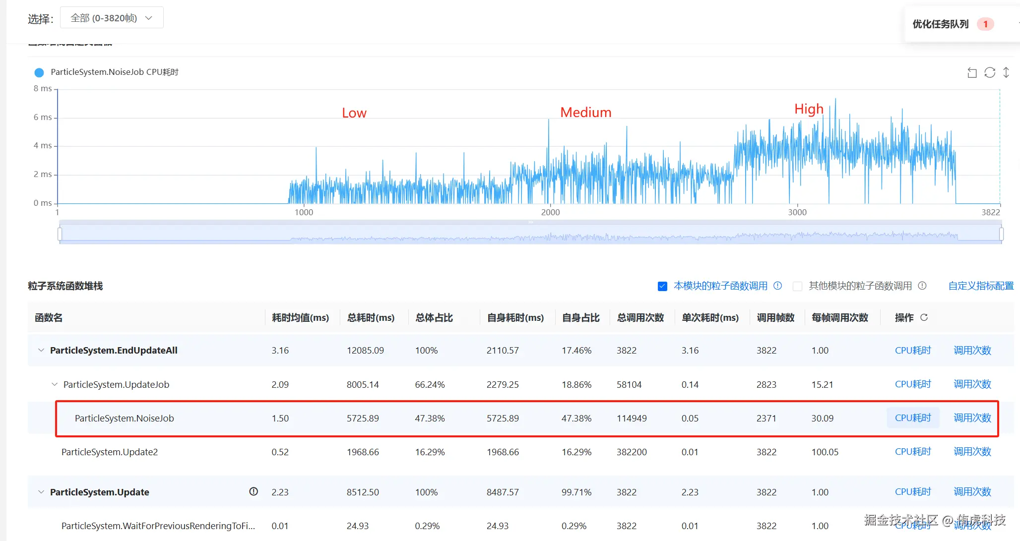 开启Noise模块后会使粒子系统耗时升高,主要开销来自ParticleSystem.NoiseJob: