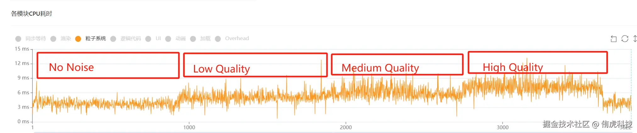 A:我在OPPO R17测了下,场景里播100个粒子系统*50粒子,前后分别设置为关闭Noise模块、开启Low/Medium/High Quality的Noise模块,得到的粒子系统耗时变化如图: