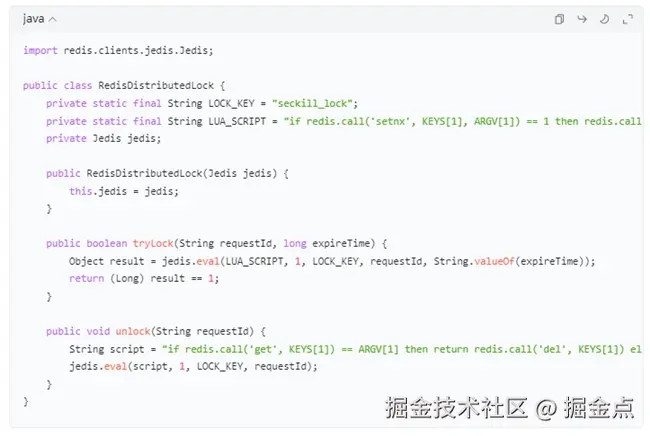 这段代码通过Lua脚本实现了分布式锁的原子性操作,避免了传统锁可能出现的问题。