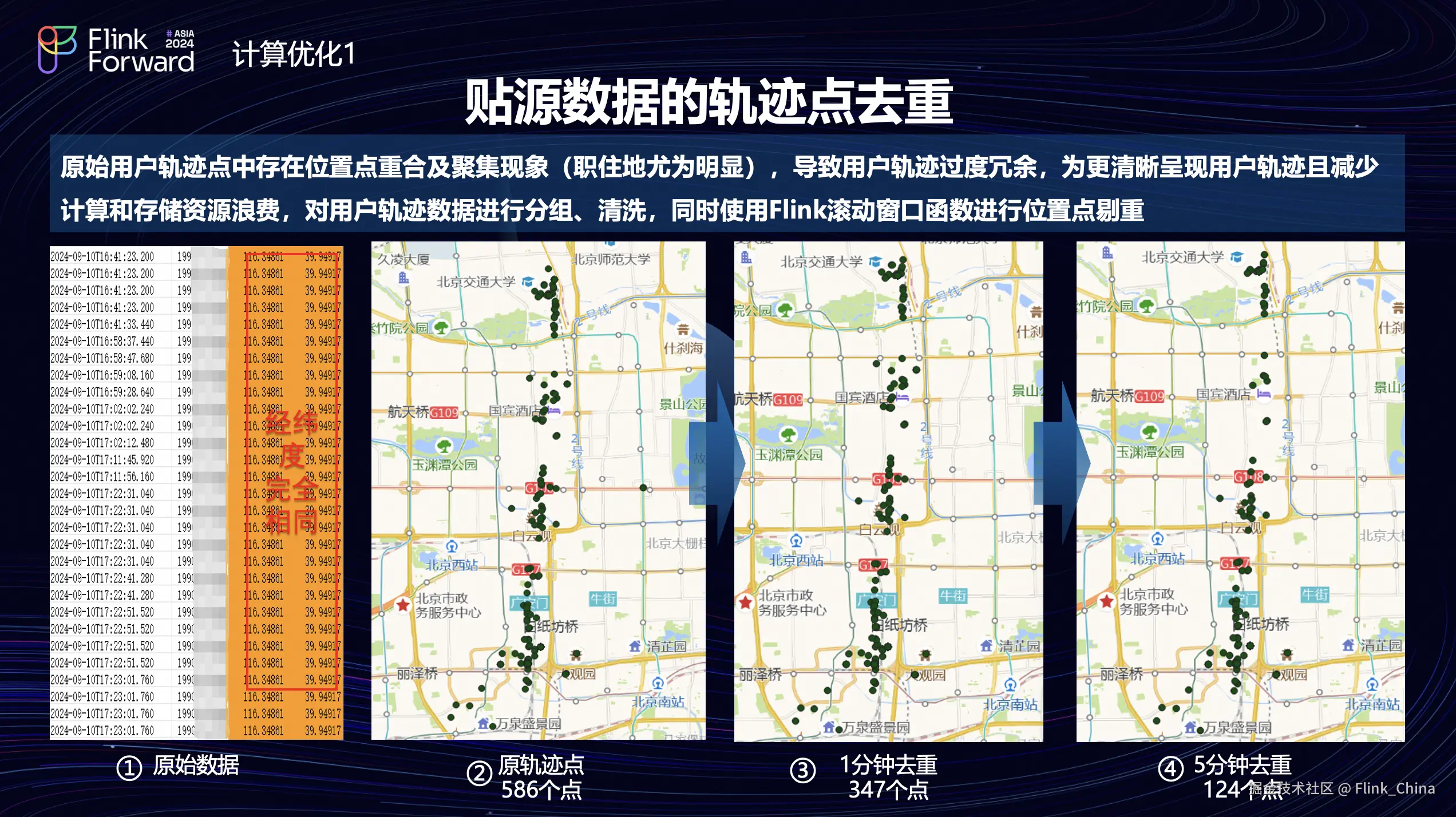 采用 1 分钟/5 分钟窗口去重技术,对轨迹点数据进行去重处理。通过对相同时间段内的重复轨迹点进行过滤,数据量压缩了 79%,减少了存储和计算的负担。