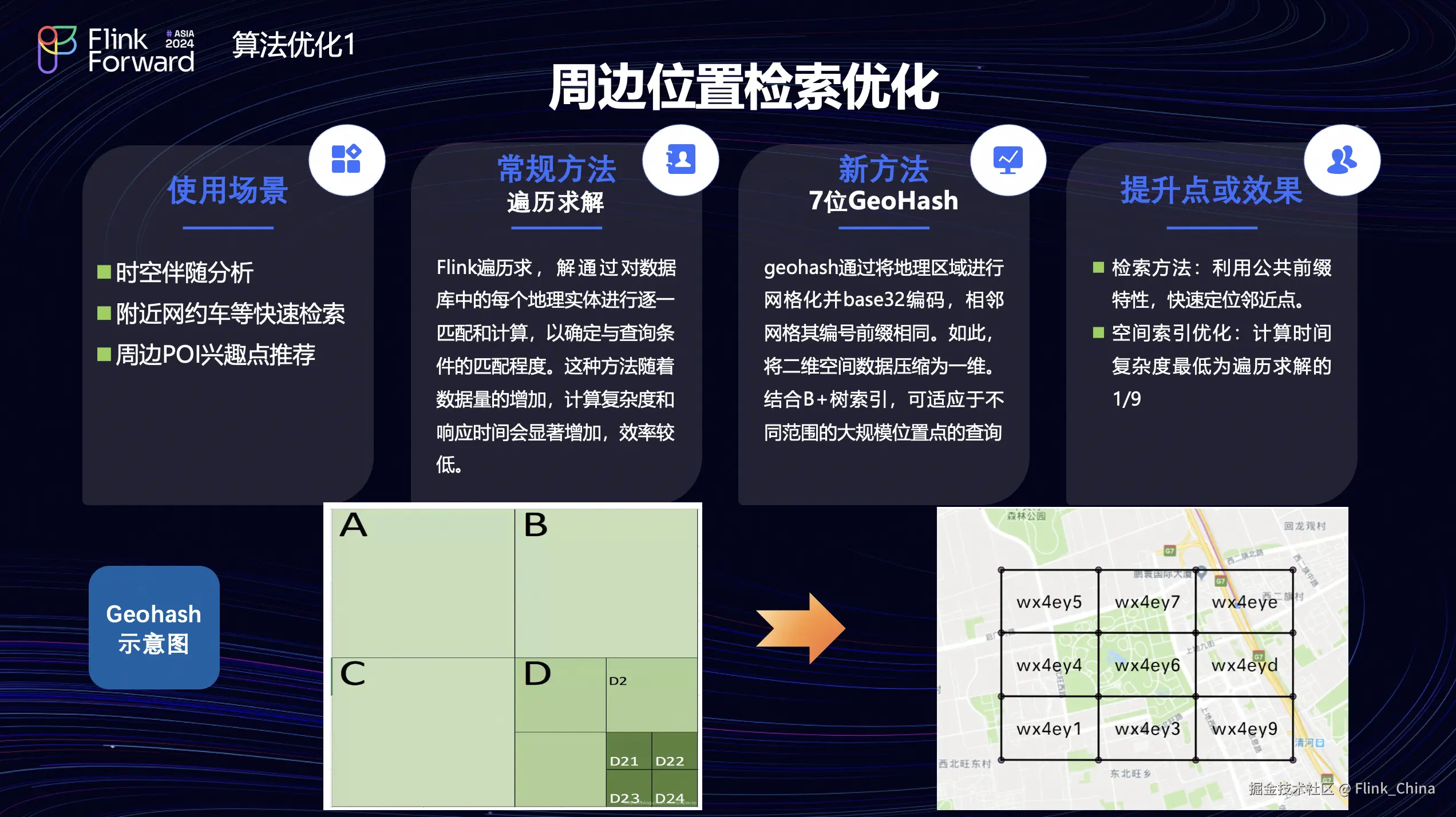 将二维空间计算转化为一维前缀匹配,通过 GeoHash 编码技术,提高了空间数据的检索效率。实验表明,该技术的检索效率提升了 9 倍,能够快速定位目标区域内的数据。