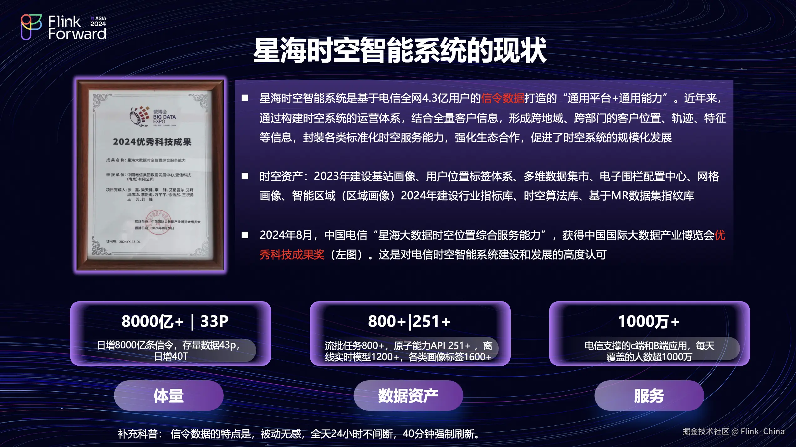 星海时空智能系统依托中国电信庞大的用户信令数据资源,涵盖了 4.3 亿用户的位置轨迹和特征信息。该系统具备强大的核心能力,日处理数据量高达 8000 亿条,数据存量达到 44,030 TB(约 43 PB),且每日增量40 TB。它能够支撑超 1000 万/日的触达用户,为众多业务场景提供了坚实的数据基础。凭借其卓越的性能和创新的技术,在 2024 年 8 月荣获中国国际大数据产业博览会优质科技成果奖。