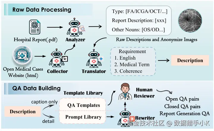 构建过程中,开发了一个多智能体数据引擎,用于从大规模原始数据中提取、清理、标准化信息,并进行专家审核。该引擎包含信息提取器、医疗案例收集器、数据清洗器、问答模板库、问答生成器和基于人类偏好的审核器等 6 个组件,最终将数据组织成封闭问答(多项选择题)、开放问答(简答题)和报告生成(长文本回答)三种类型的 VQA 任务。