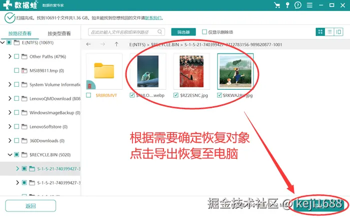 第三步:等扫描结束,找到需要恢复的文件后,勾选它们。最后,点击 【导出】 ,确认保存位置并开启恢复。等待文件恢复完成,你就可以在选定的位置找到这些文件了。