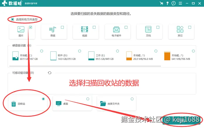 第二步:选择需要恢复的文件类型和丢失文件的位置,并开启扫描,使软件搜索指定数据。