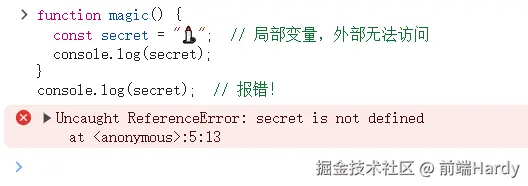 const secret = "magic专用,不外出!"; // 局部变量,外部无法访问