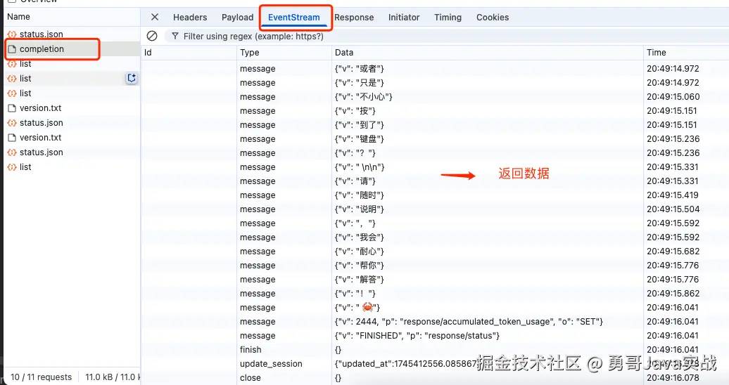 当在 DeepSeek 对话框发送消息后,浏览器会发送一个 HTTP 请求 ,服务端会通过 SSE 方式将数据返回到浏览器。