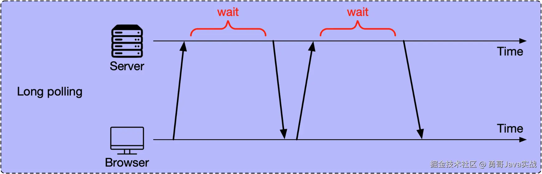 浏览器发送 HTTP 请求后,服务器 挂起连接 直到数据更新或超时,返回响应后浏览器立即发起新请求。