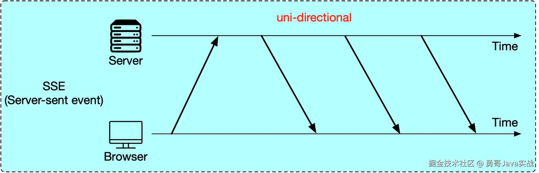 基于 HTTP 协议,服务器可 主动推送 数据流(如Content-Type: text/event-stream),浏览器通过EventSource API 监听。