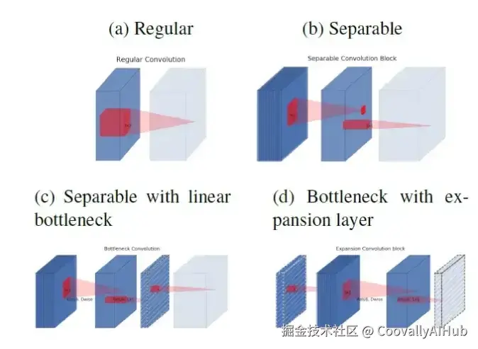 倒置结构优化: MobileNetV2创新性地将流程反转为"压缩→扩展→再压缩"(图3b)。通过先使用1×1卷积将输入通道压缩至1/6,再应用3×3深度可分离卷积,最后线性压缩输出。这种设计使中间层通道数显著减少,内存占用降低15%。