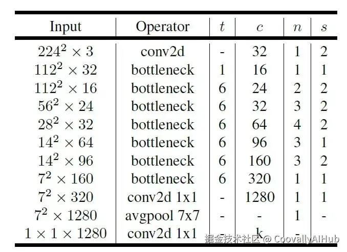 MobileNetV2的整体结构由多个这样的瓶颈层堆叠而成。下图清晰地细分了瓶颈层的数量、每个阶段的输入大小以及每层应用的操作。它重点介绍了该架构如何从包含32个滤波器的卷积层开始,然后应用19个具有不同扩展率和卷积操作的残差瓶颈层。