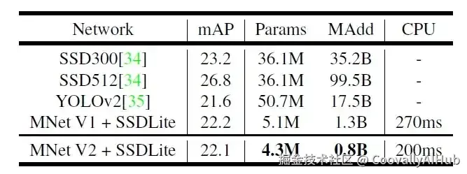 在COCO数据集上,MobileNetV2+SSD Lite仅需2.1M参数、800MAdds即达到22.1%mAP