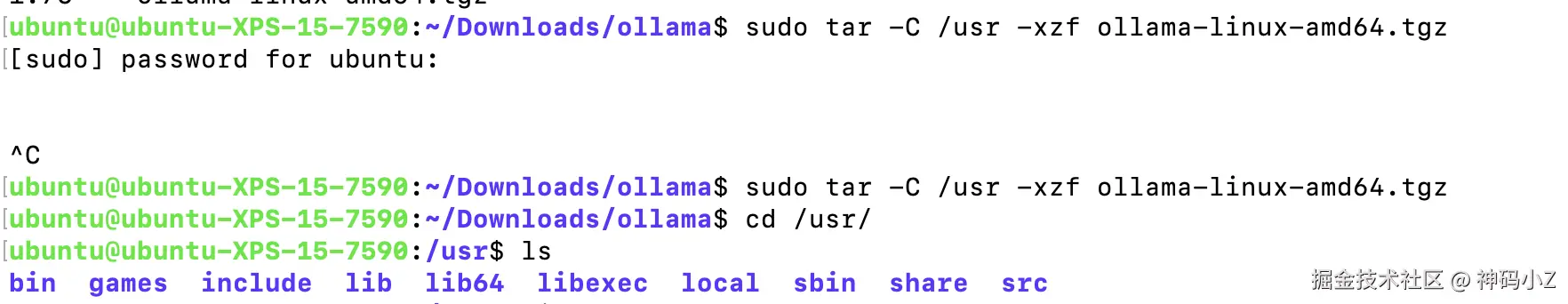 这里我们使用以下命令将ollama-linux-amd64.tgz解压到/usr目录下