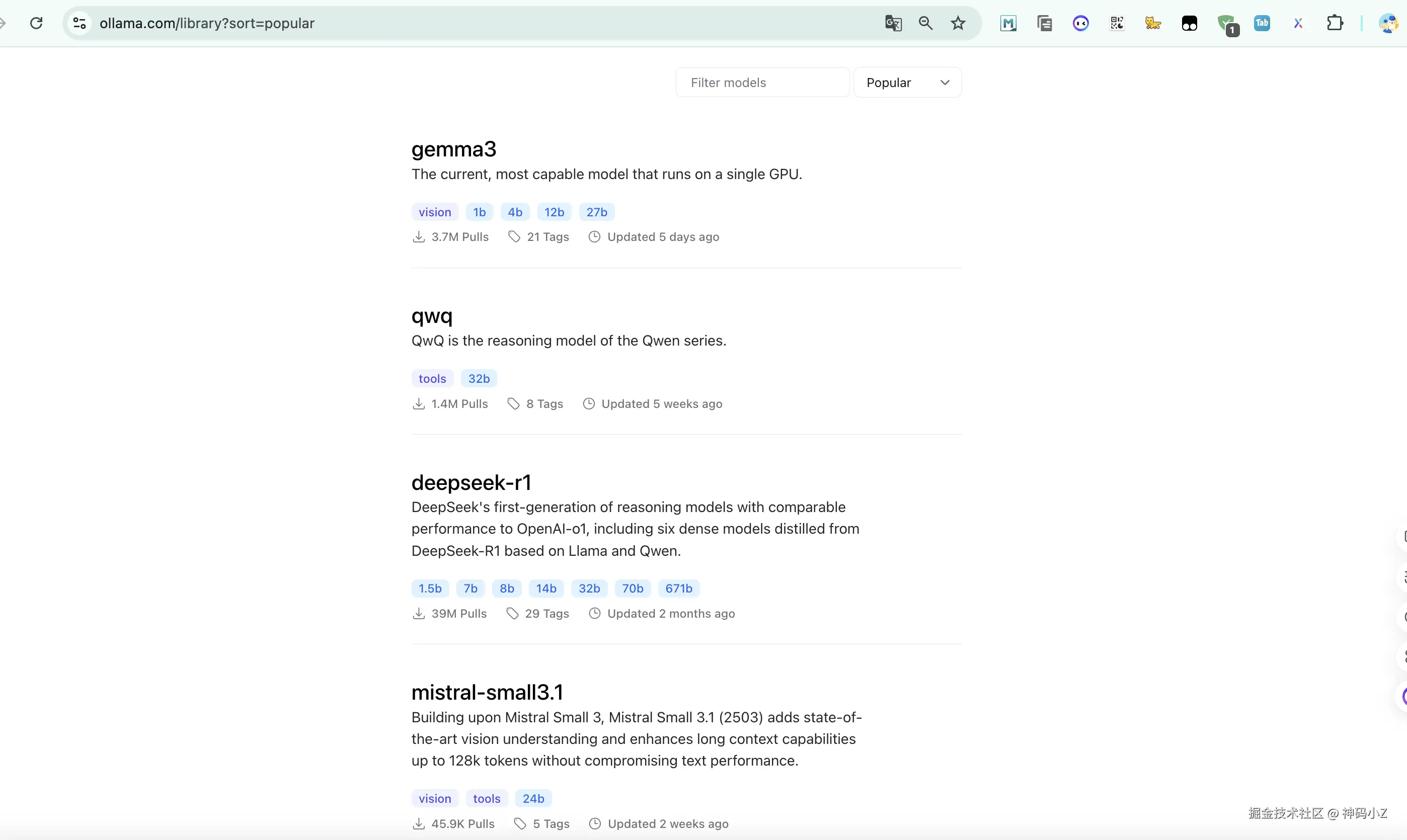 这里我们去到ollama官网地址:ollama.com/library,这里自动按当前流行程度做好了排序